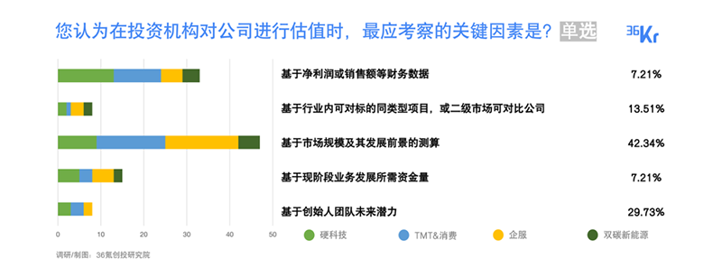在调研中,42%的创业者表示应该基于市场规模和发展前景测算,还有30%的人认为应该基于创始团队。在消费互联网时代,这两点就是较常见的估值心态,在硬科技时代这一点并无显著变化。