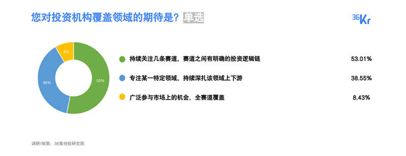 尽管“全周期、全阶段基金”足以给大家“轮轮融资、层层加注”的安全感,但在”投资机构覆盖领域期待”这一选项中,一些创始人们的思考更为现实:他们希望投资人能够有明确清晰的投资逻辑链,持续专注几条特定赛道、甚至精专在一个赛道。