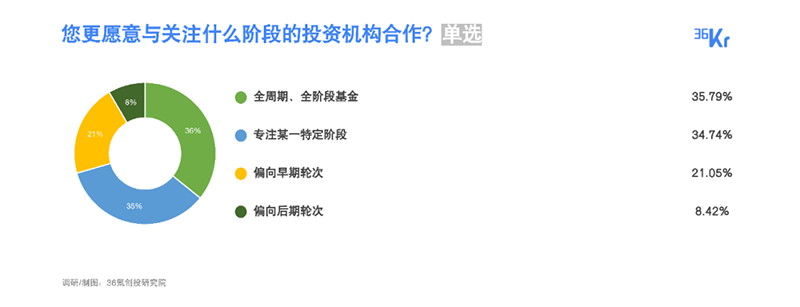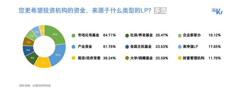 有四分之一的创始人明确在意投资机构的更上一层——背后的LP类型。他们偏好的LP构成依次降序是:市场化母基金(65%)、产业资金(62%)、国资/政府背景(38%)。