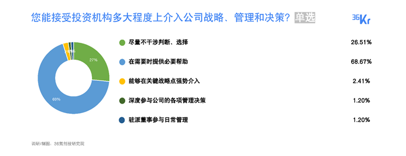 “不要催我长大,见证我的成长,必要之时扶我一把。”一位创始人在形容“理想投资人”形象时,如此向我们表示,这一定程度代表着广大创始人的心态。调研显示,“在需要时提供必要帮助”(69%)和“尽量不干涉判断、选择”(27%)是大多数founder的需求,仅有4份问卷选择了可以接受投资机构较为深度地介入战略层面(合计5%)。